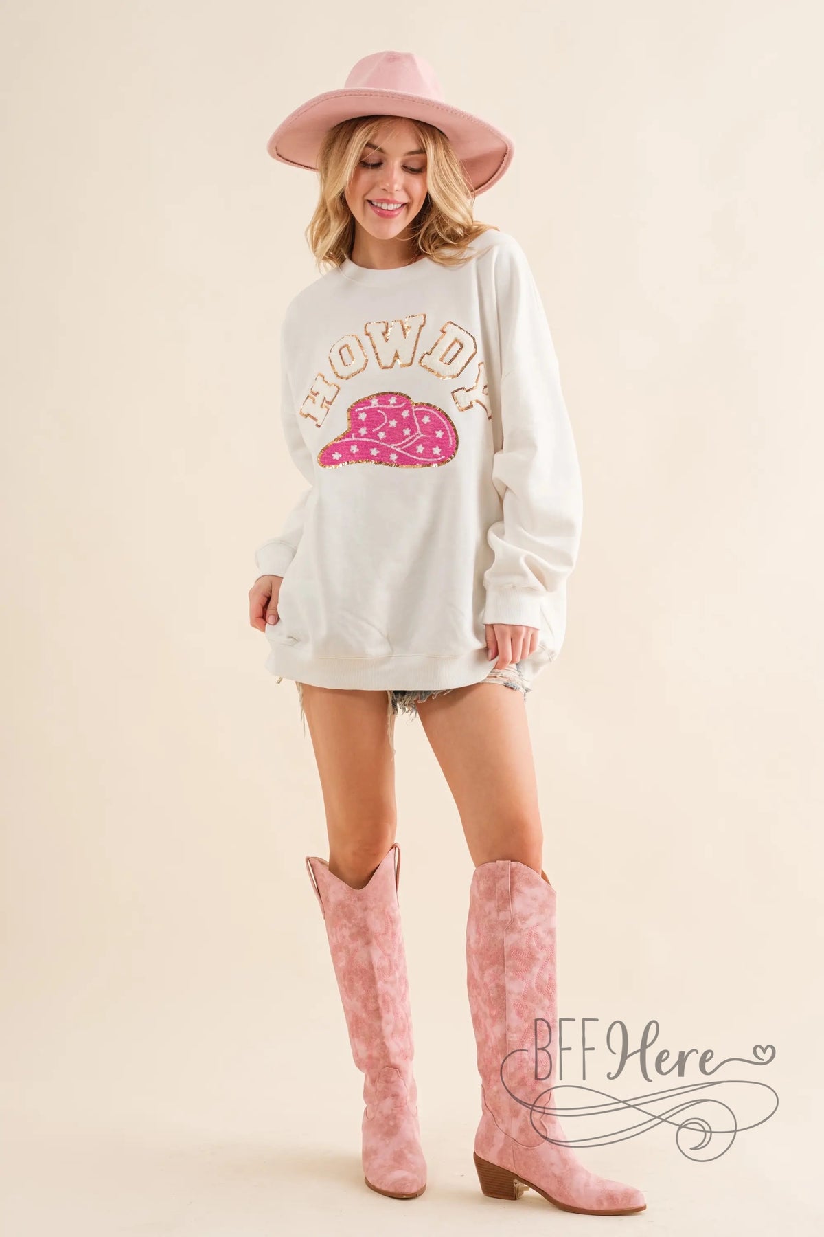 Fleece terry howdy patch embellish y'all back graphic sweatshirt