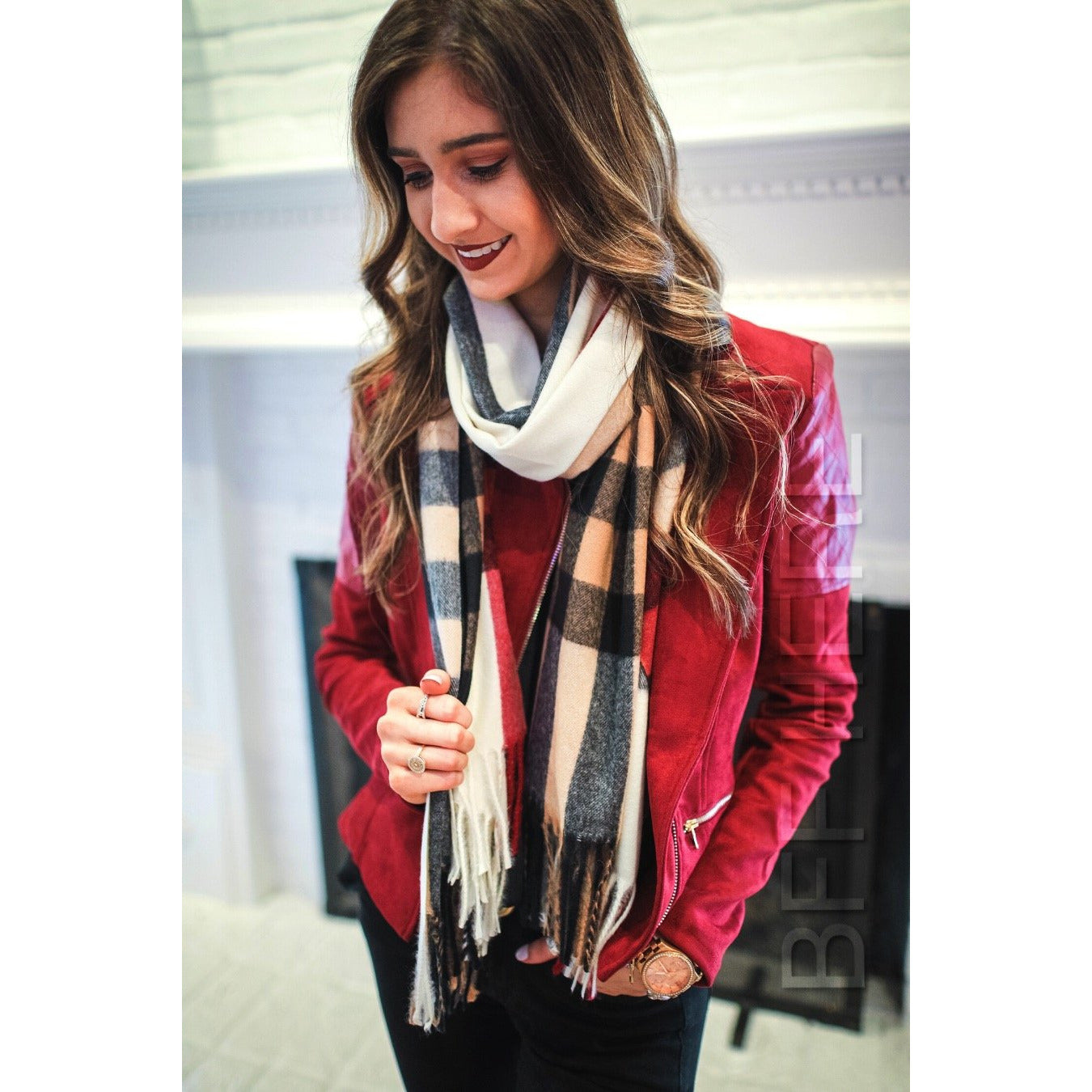 These gorgeous scarves are the absolute softest thing we've felt this season and come in two stunning colors! It features a plaid fabric that can be worn every cold day of the year, dressed up or down! These look very similar to the designer scarves! This an open long scarf, not an infinity scarf!