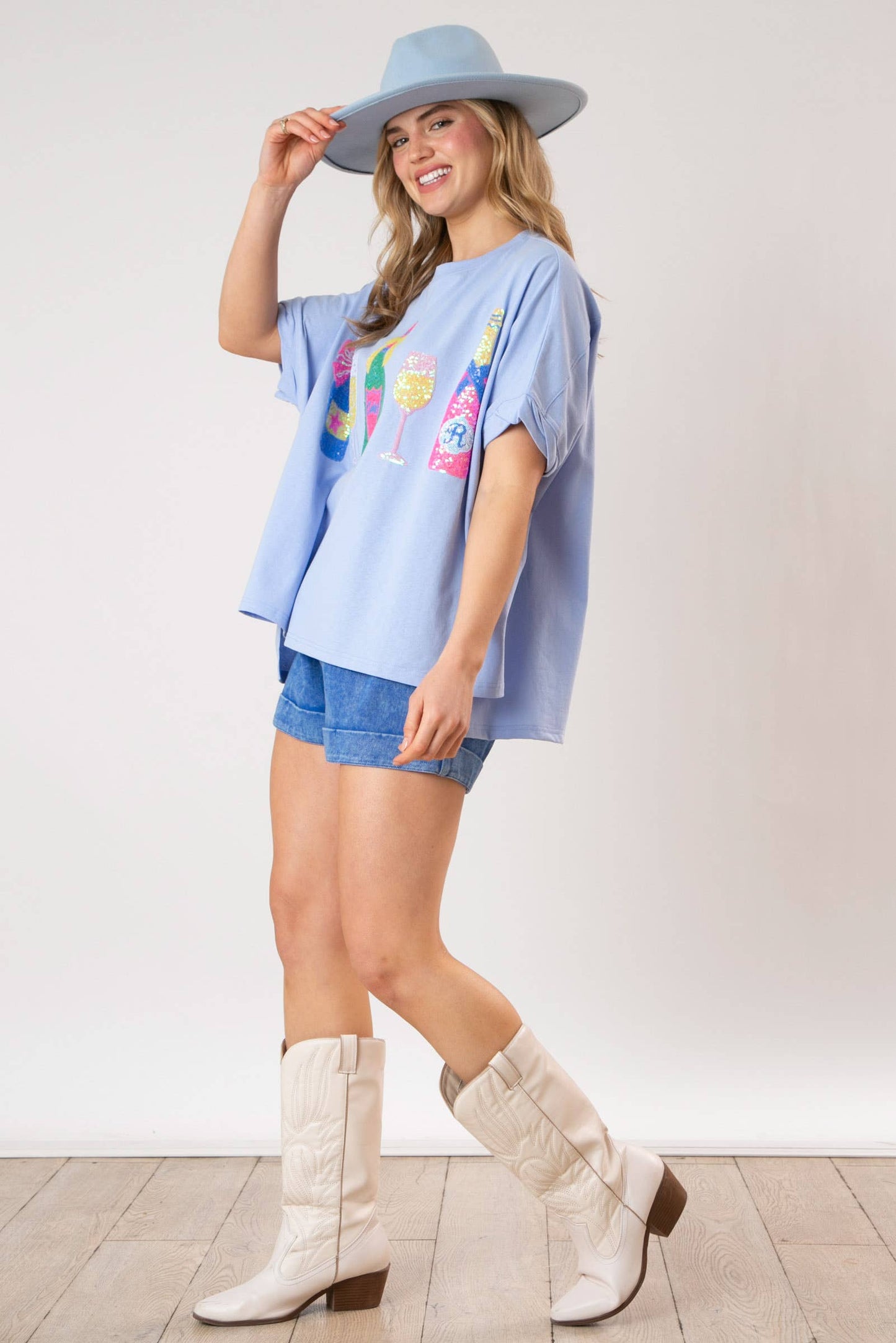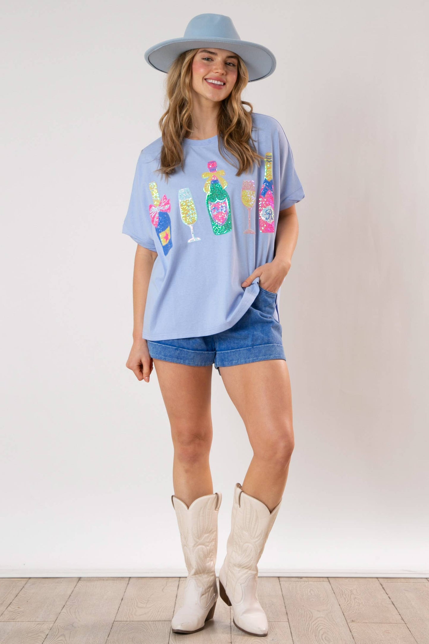 This Champagne Cheers Top is perfect for any celebration! The loose fit and short sleeves provide comfort, while the sequin champagne bottle and glass embellishments add a touch of glamour. The asymmetric high-low cut adds a unique detail to this top. Cheers to style and comfort with this top!