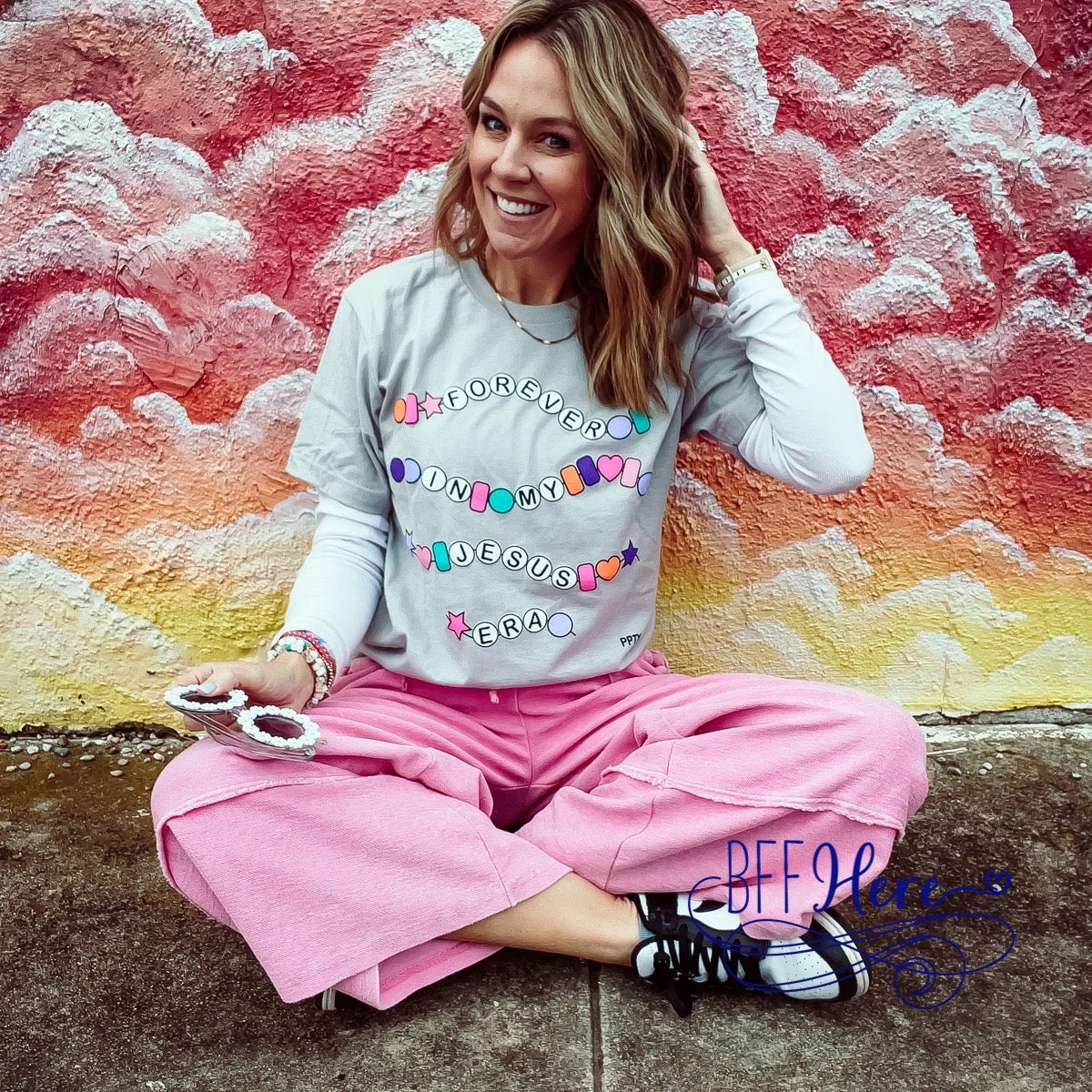 Embrace the eternal good vibes with our Forever in my Jesus Era tee. Featuring the iconic phrase spelled out in colorful friendship bracelets, this playful and quirky shirt is a fun way to show off your faith and style.