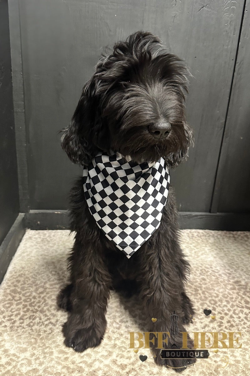 This wildrag features a bold white and black checkered print, perfect for adding a touch of cool to your racing outfit.