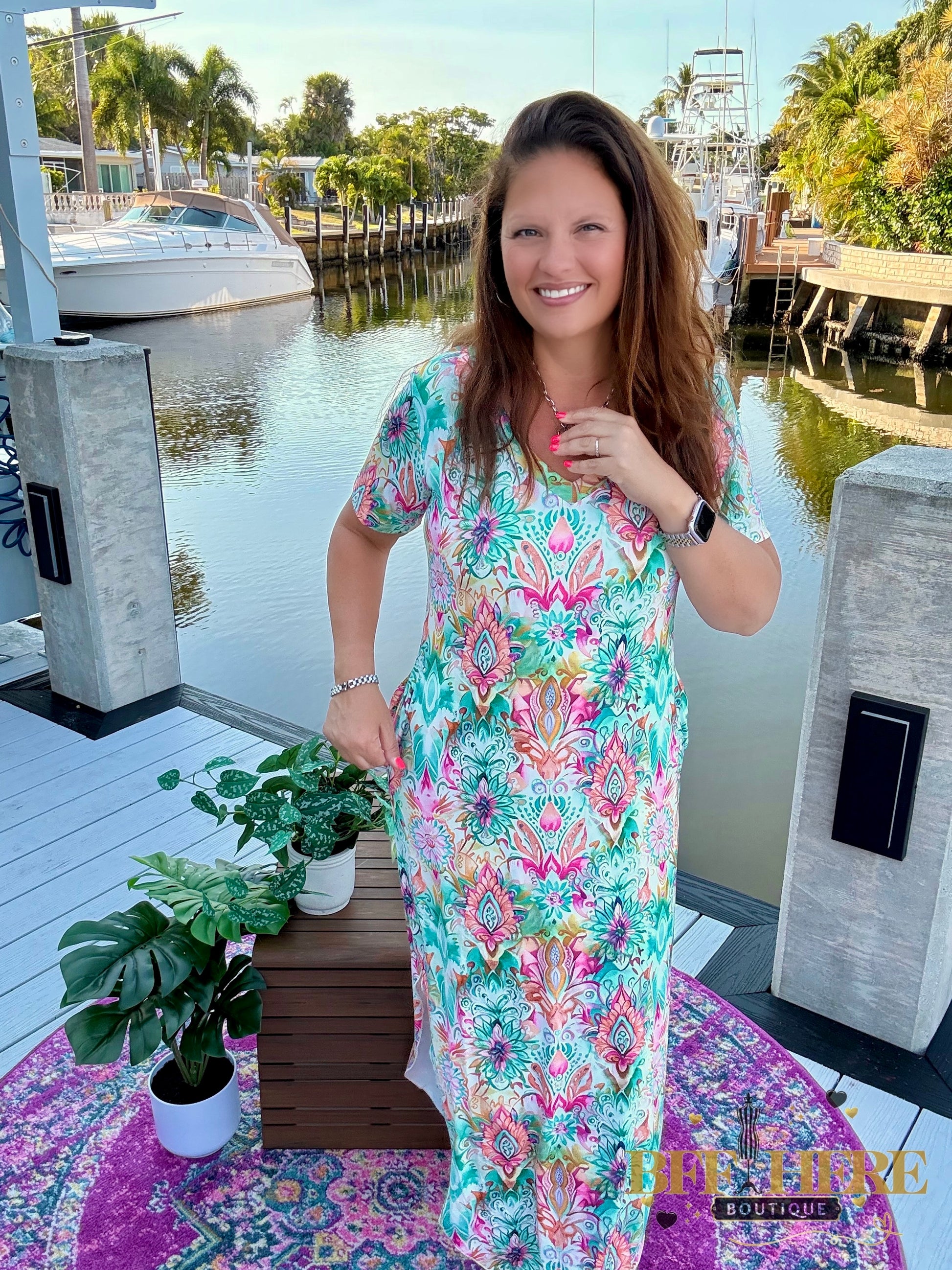 Get ready to float through sunny days in style with our Pink Skies Maxi Dress! This cute and flattering dress boasts a buttery soft fabric in a colorful print, making it perfect for Easter and all your spring festivities. So go ahead, embrace those pink skies and turn heads wherever you go! ***this has pockets!!!***