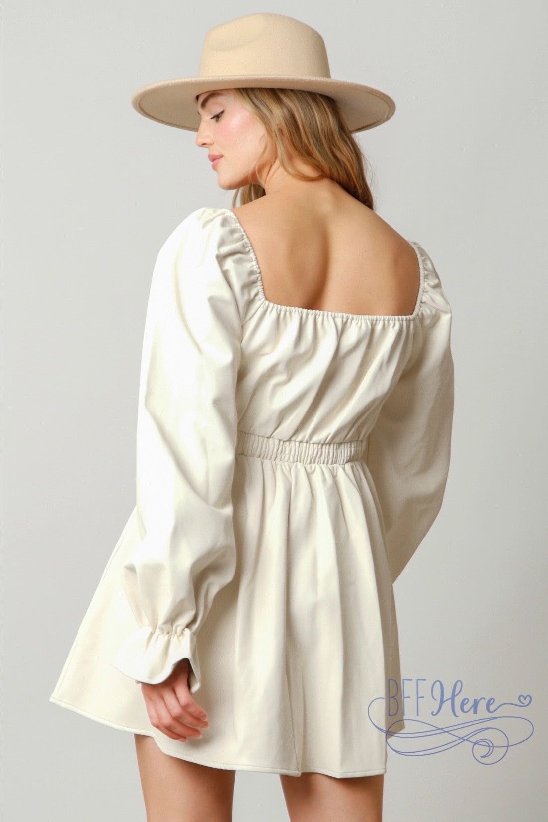 Crafted with a faux leather base, adorned with allover multicolored dots, and featuring square neck and long sleeve detailing, this dress adds unique elegance to your wardrobe.