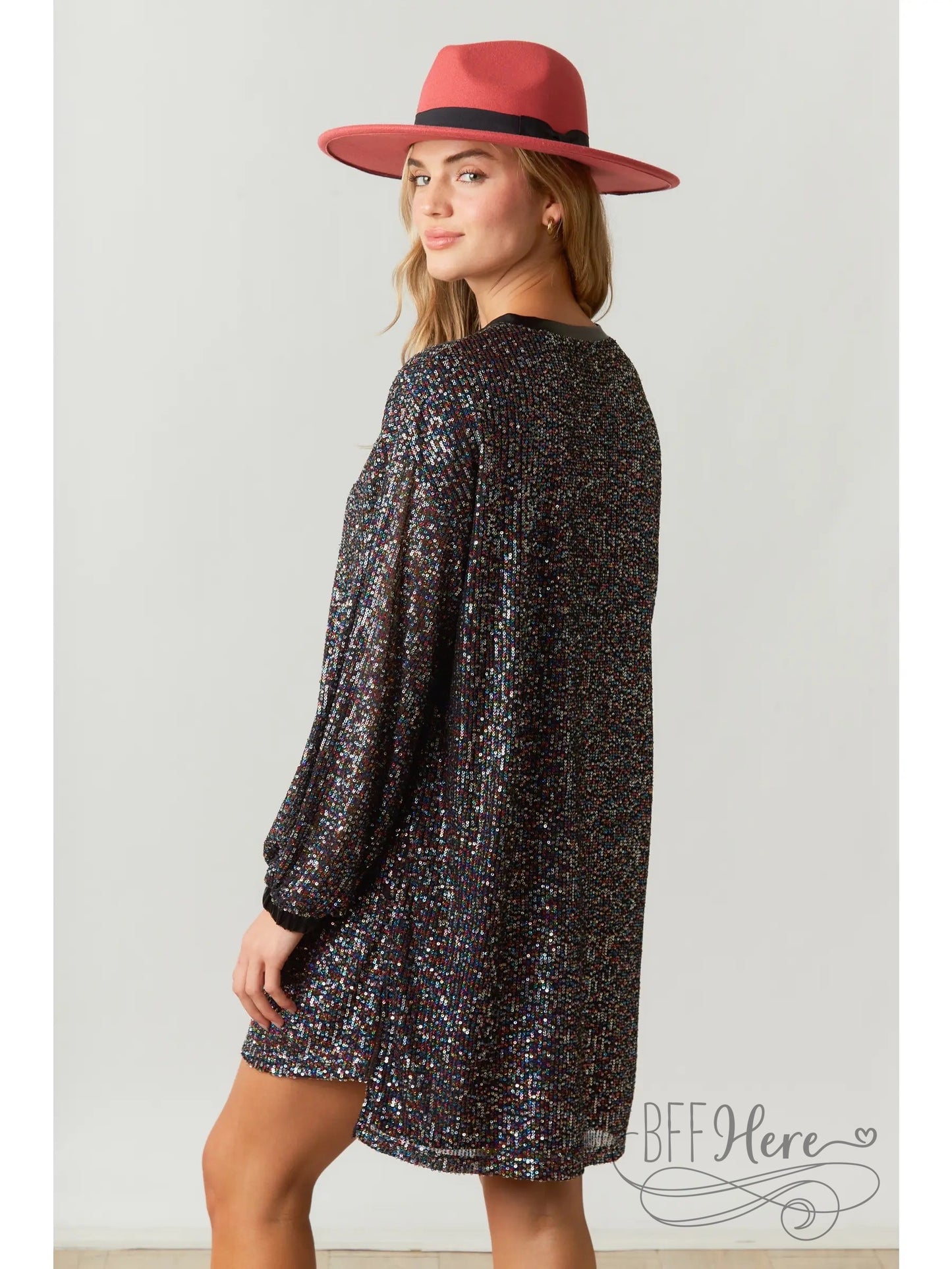 Featuring a festive round neck, long sleeves, and multi-color black sequins, this stylish dress will be the perfect addition to any celebration.