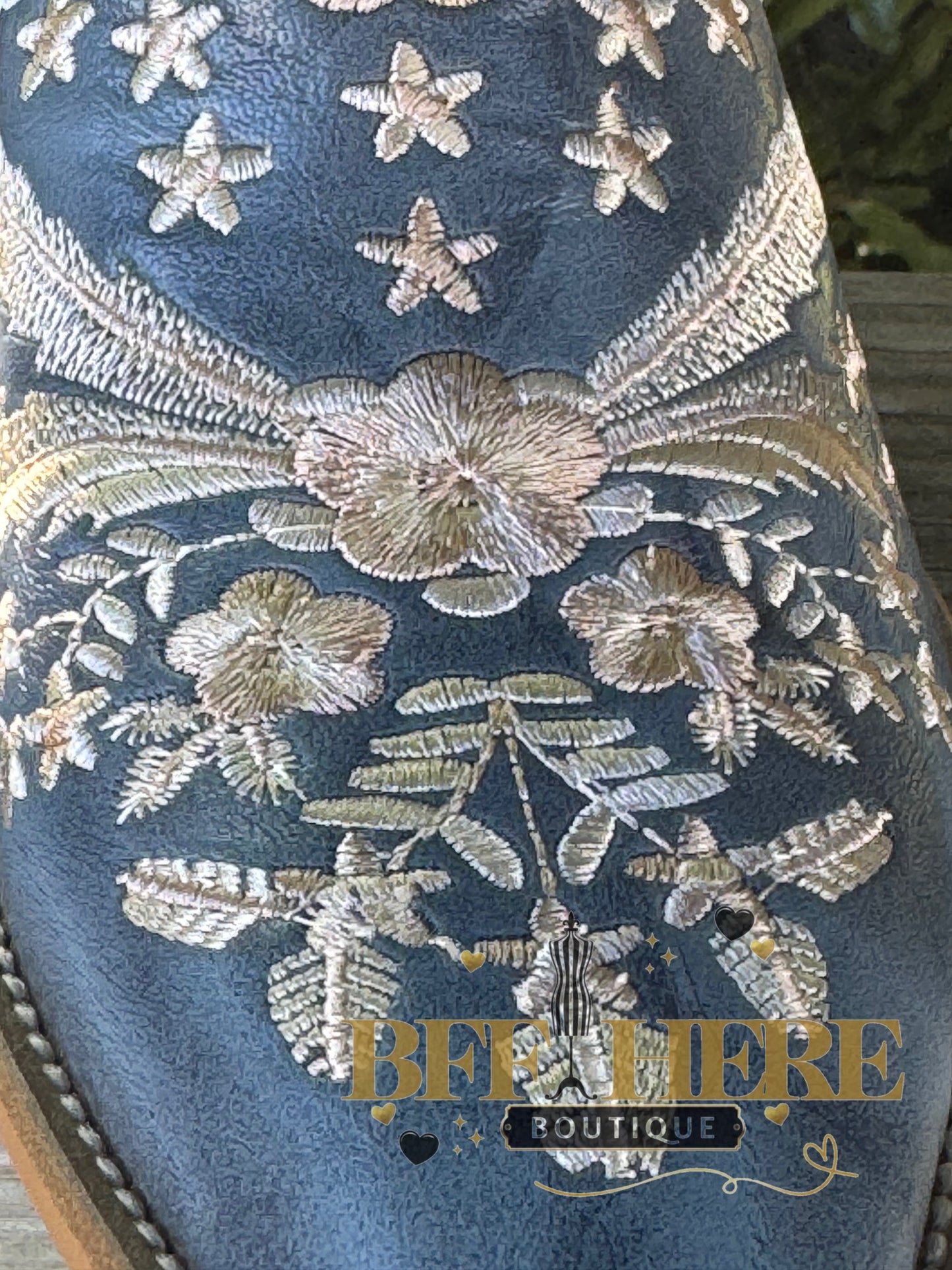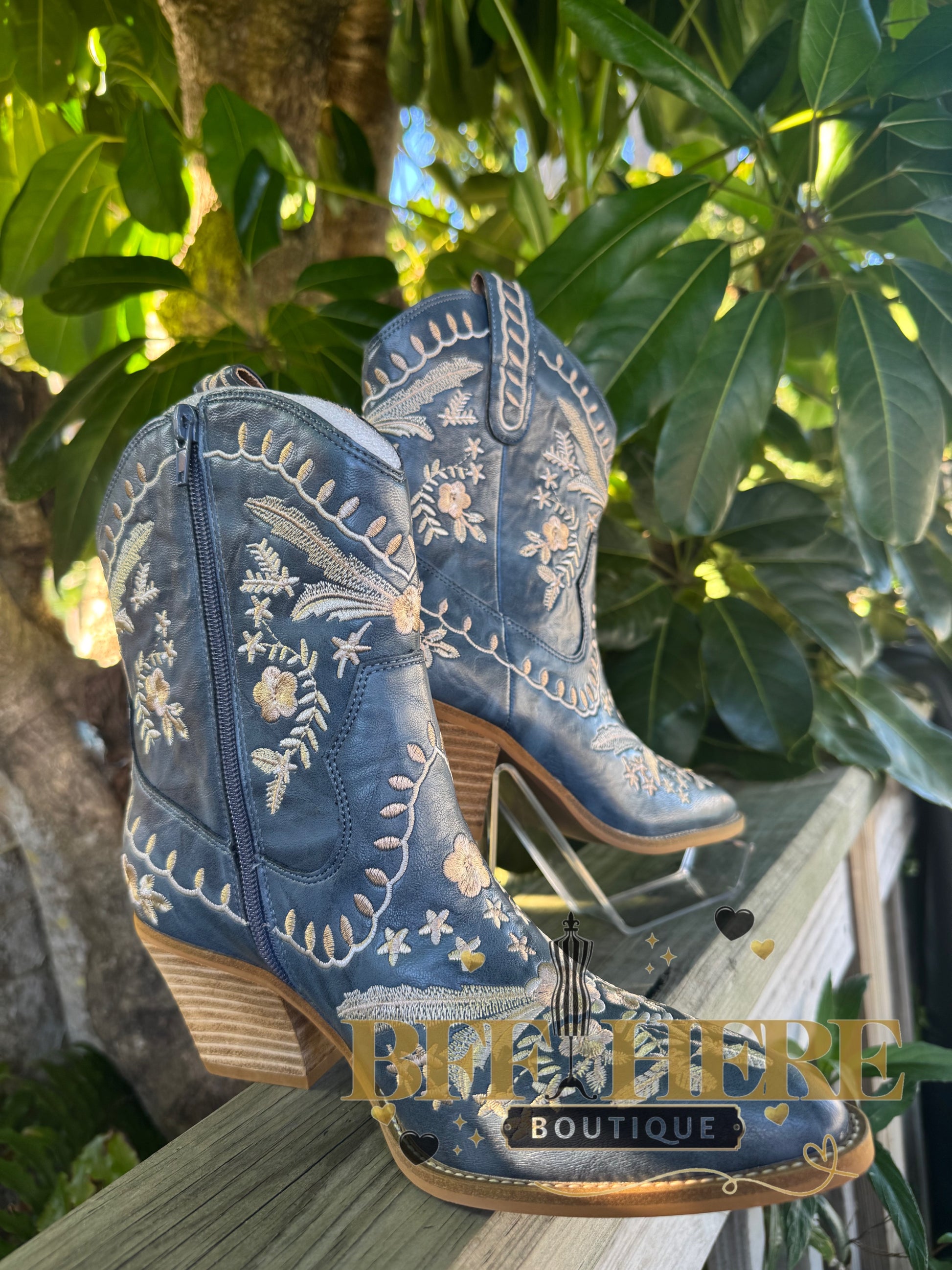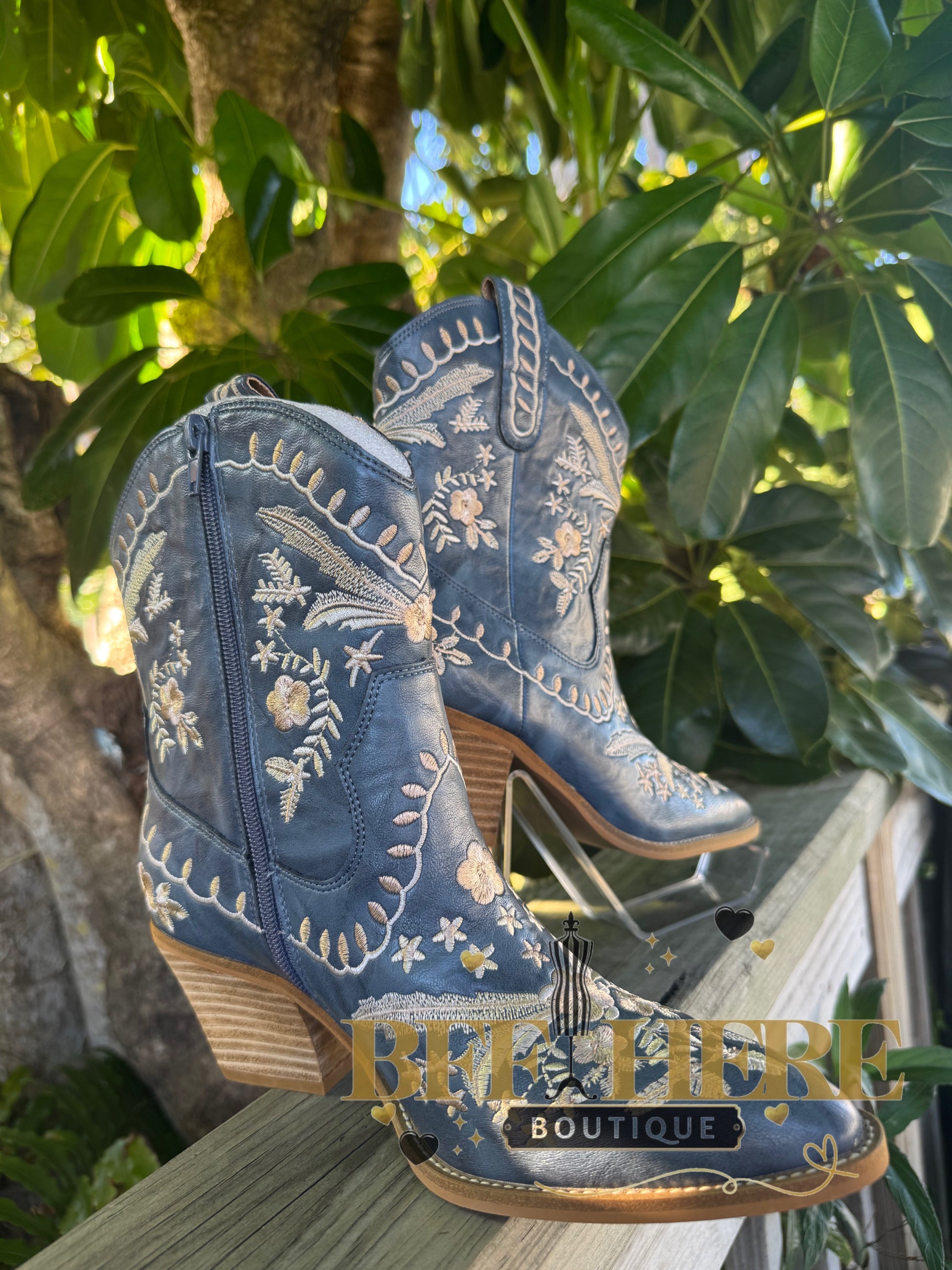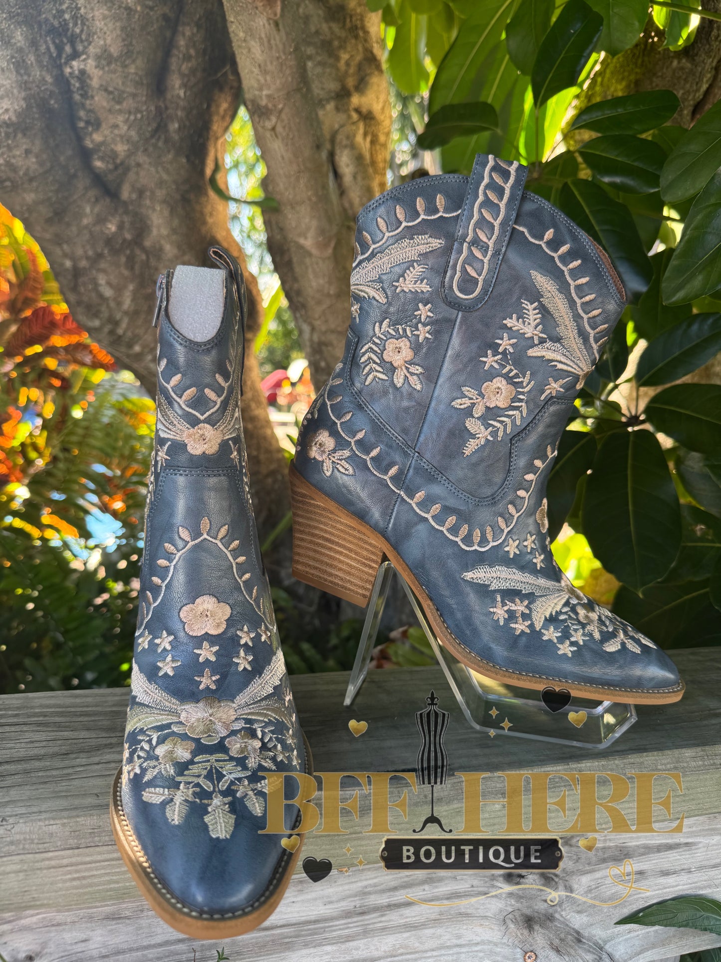 Introducing the Let's Go Girls - Blue by Corkys! This stylish boot features intricate embroidery details that add a touch of sophistication. Comfort and style come together, making this a must-have for any fashionista.