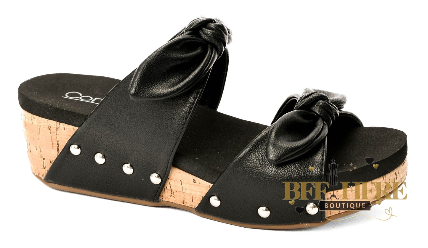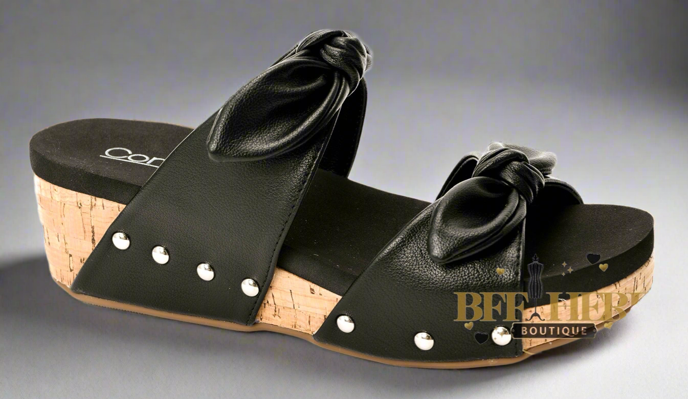 Elevate your style and comfort with our Sittin Pretty wedge sandals in black by Corkys. Designed with a practical yet stylish wedge, these sandals offer the perfect balance of fashion and function.