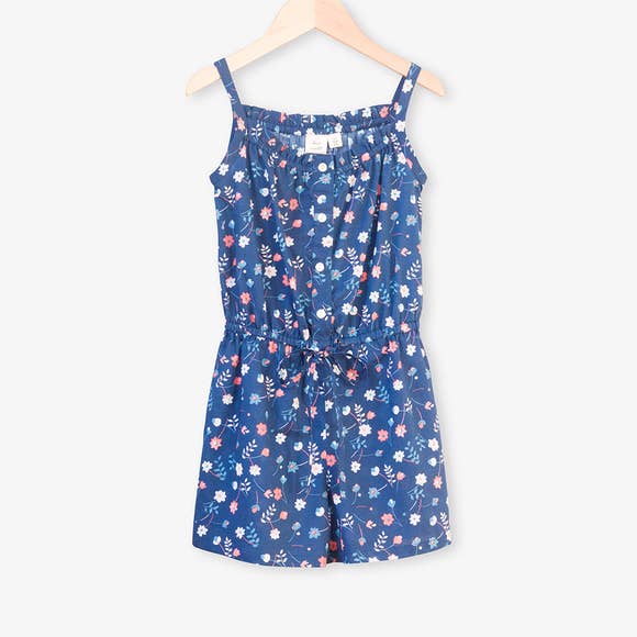 - Every girl loves a good romper ‘coz why bother with two pieces when you can have it all in one! A ruffled yoke, drawstring waist and shorts – in our signature wild flower print. This jumpsuit demands an adventure! 100% cotton.