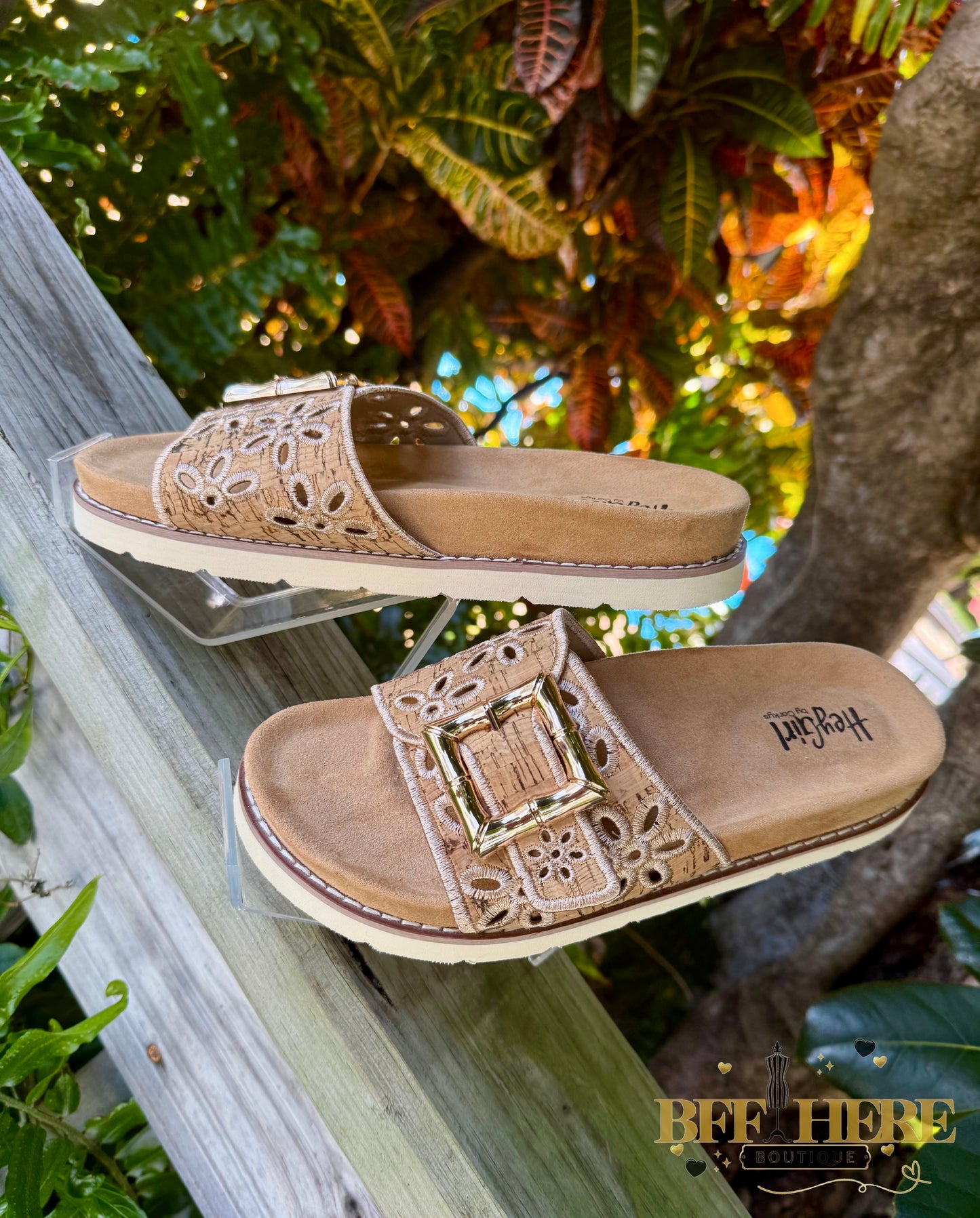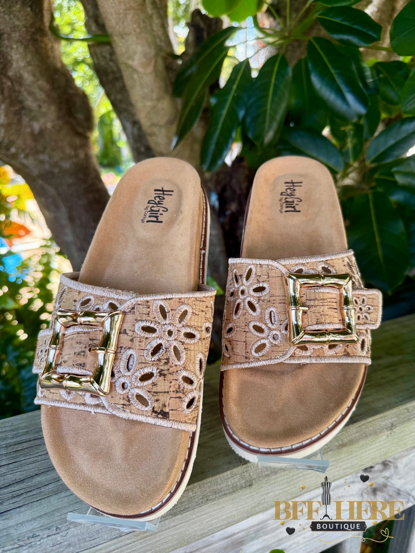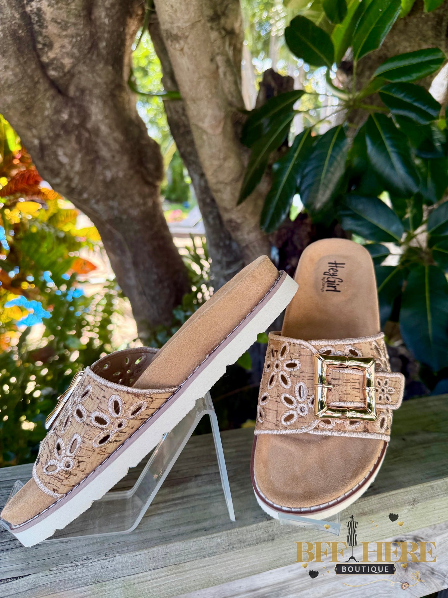 These flirty slides are about to steal the spotlight and your DMs! The Slid In My DM sandals feature a chic cork-textured strap with eyelet floral cutouts and a bold gold buckle for just the right touch of glam. Lightweight, comfy, and easy to throw on, they’re the perfect mix of laid-back and luxe.