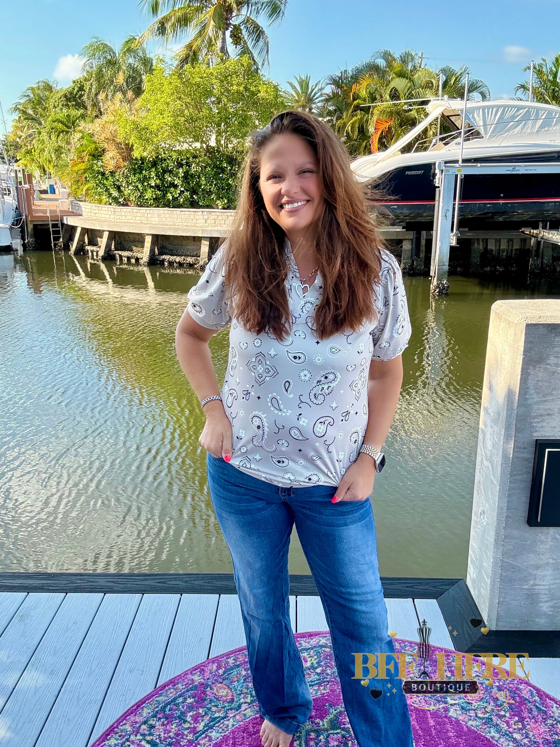 Introducing The Paisley Top - the ultimate blend of cute and chic. This top features a tan paisley design and adorable bubble sleeves that will elevate any outfit. Say goodbye to boring outfits and hello to a playful yet stylish look with The Paisley Top!