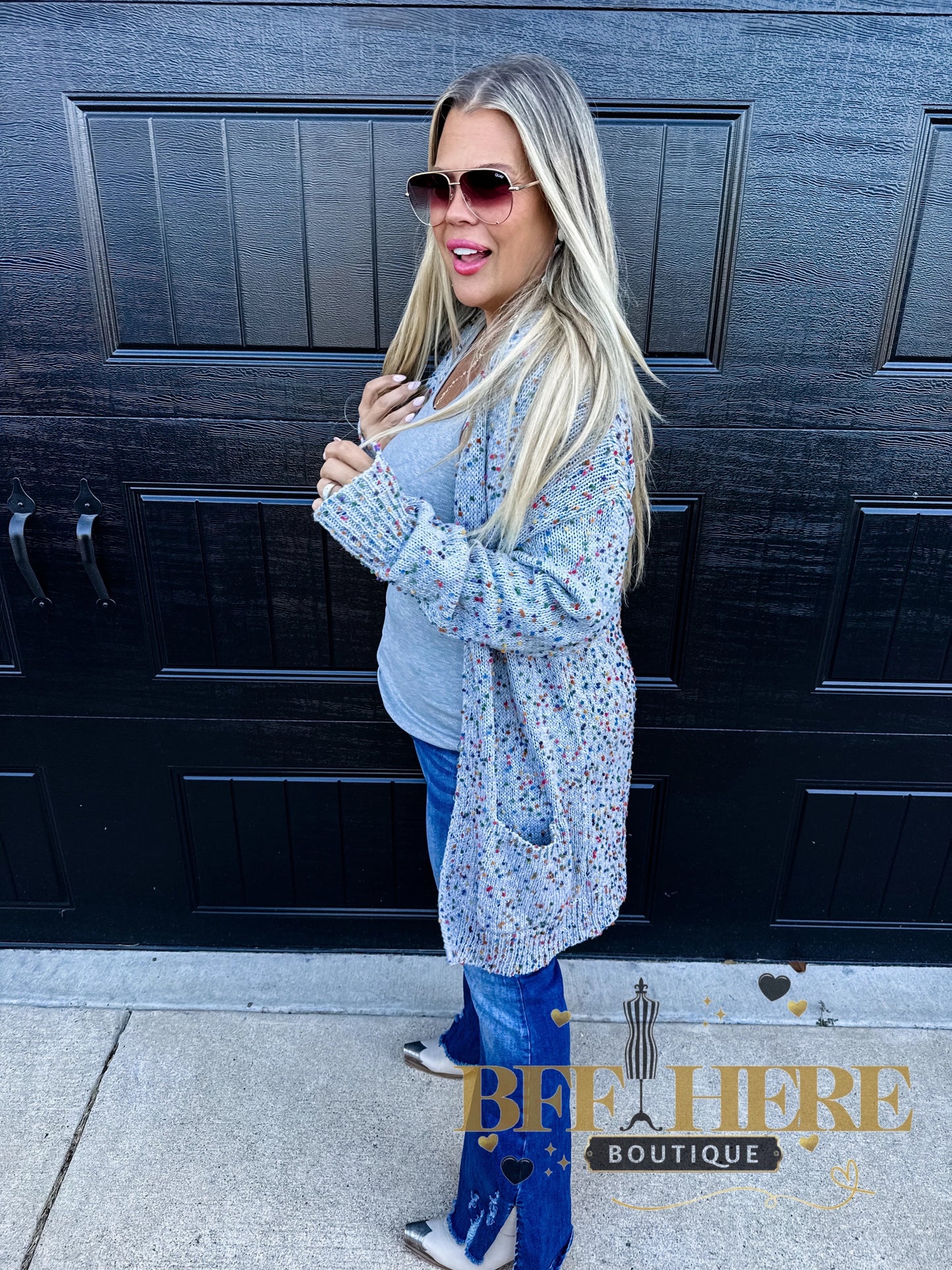 Spring colors are here! This cardigan is everything!! Chunky sweater knit fabric that is cozy and soft! Features size pockets and multi-color "confetti" dots throughout.