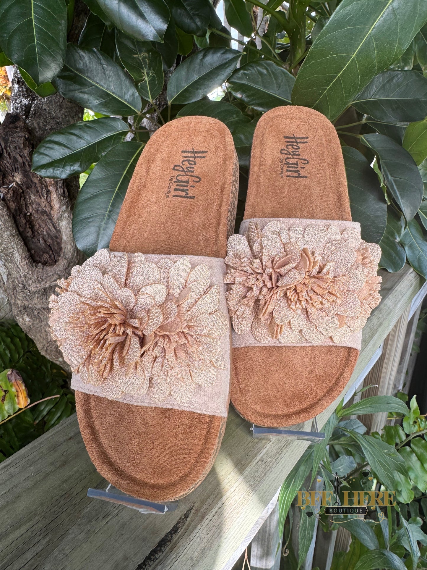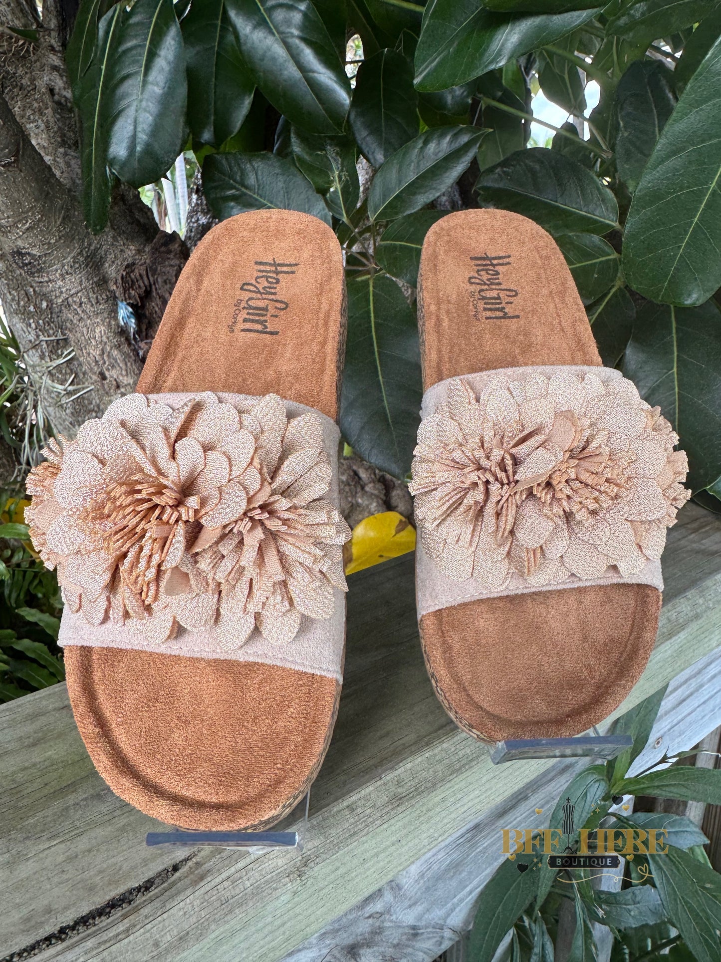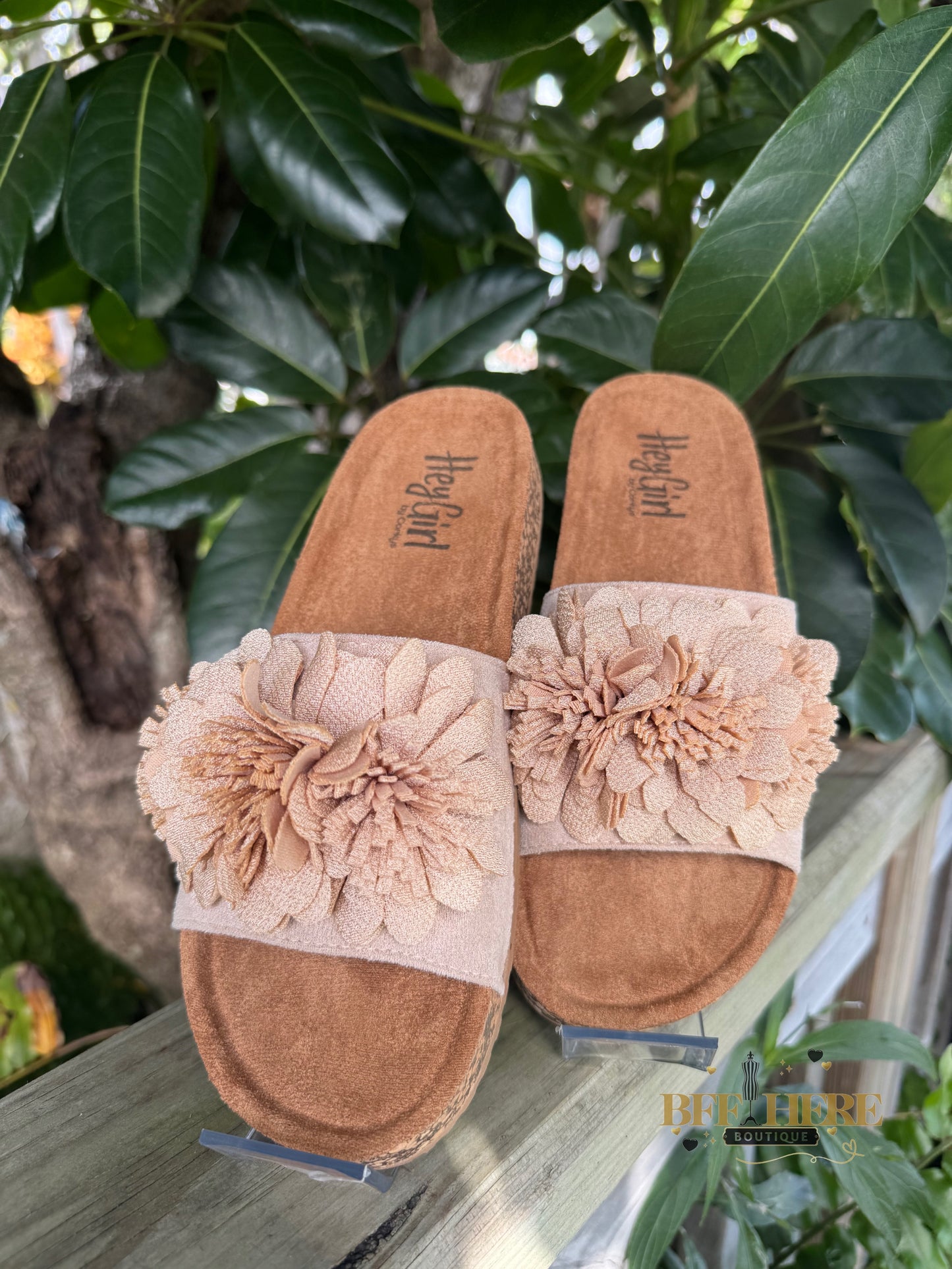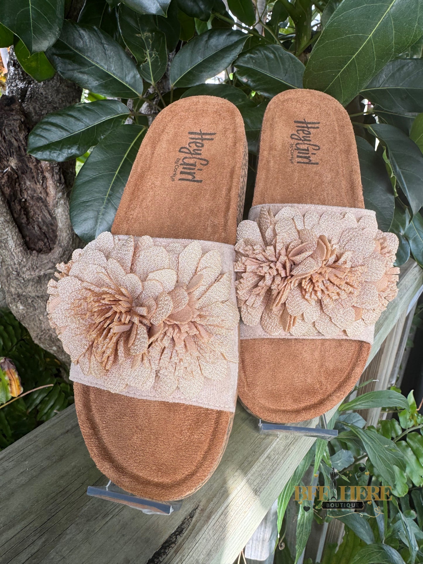 Get ready to turn heads with the Wild Child by Corkys! These ultra-feminine slide sandals bring the perfect mix of boho charm and effortless comfort. Featuring a plush floral embellishment, a soft suede-like footbed, and a cushioned sole for all-day wear, these beauties are a must-have for any free spirit.