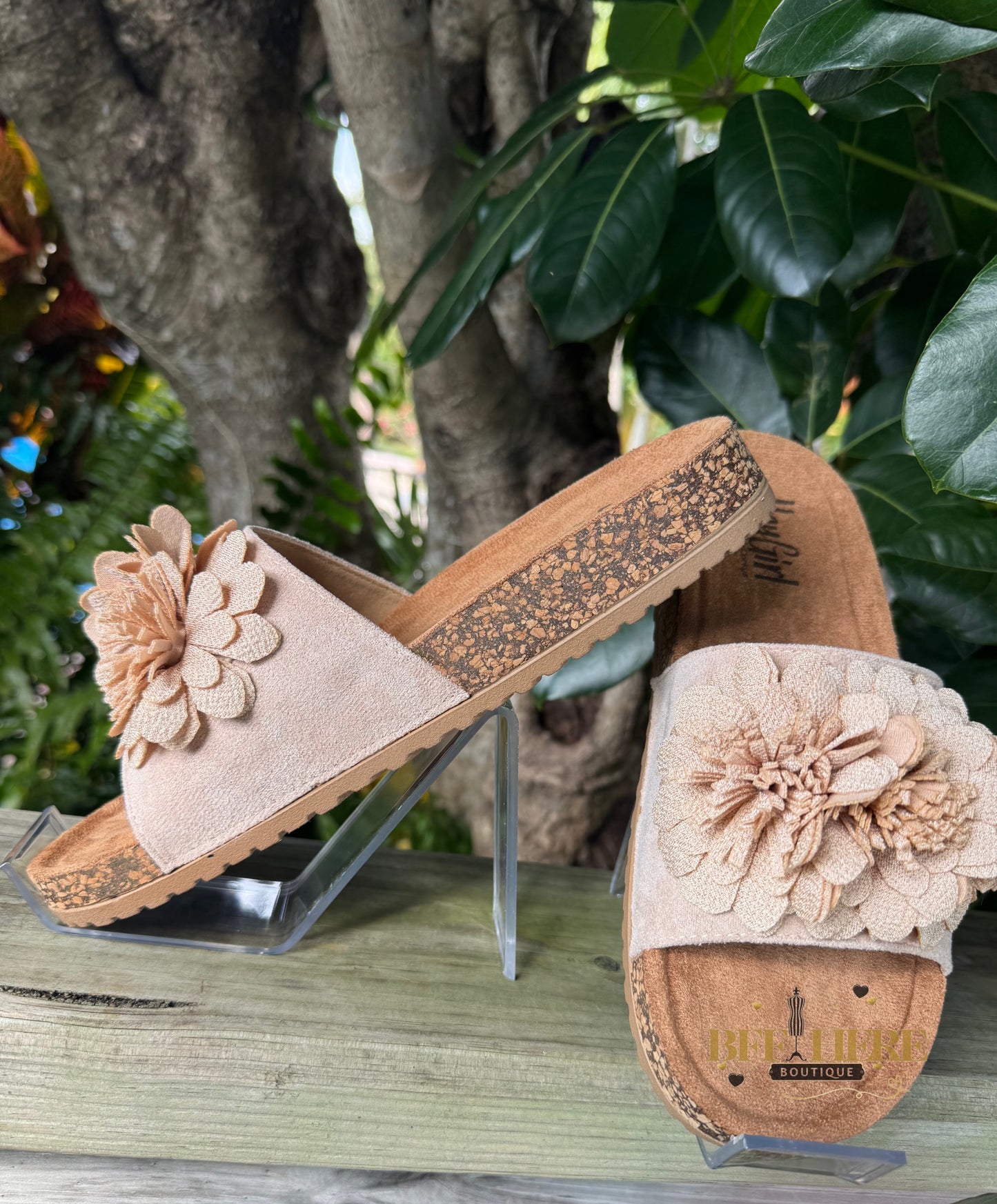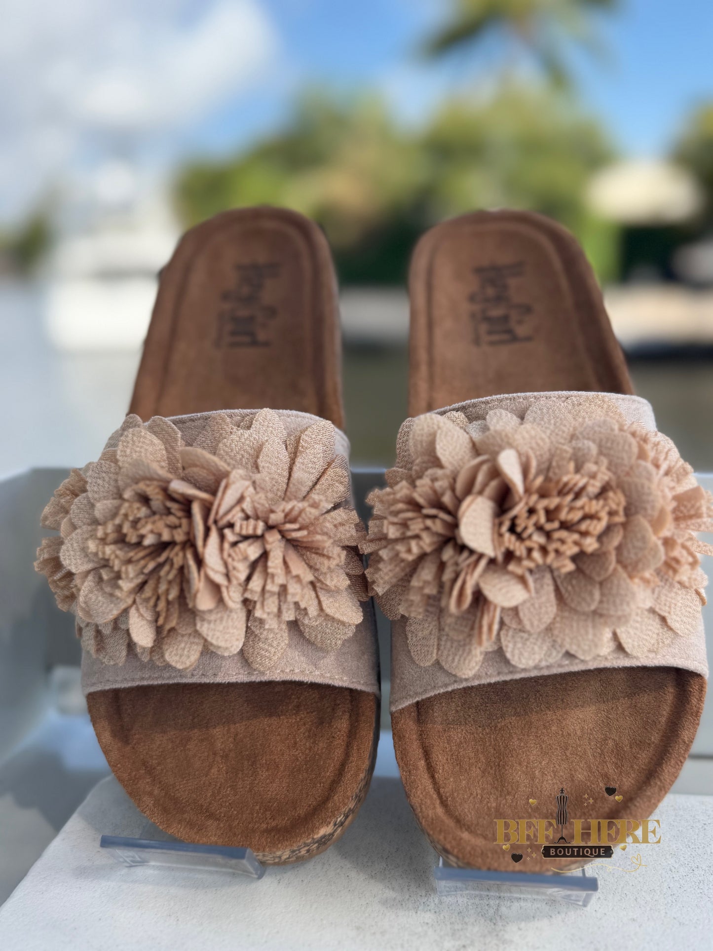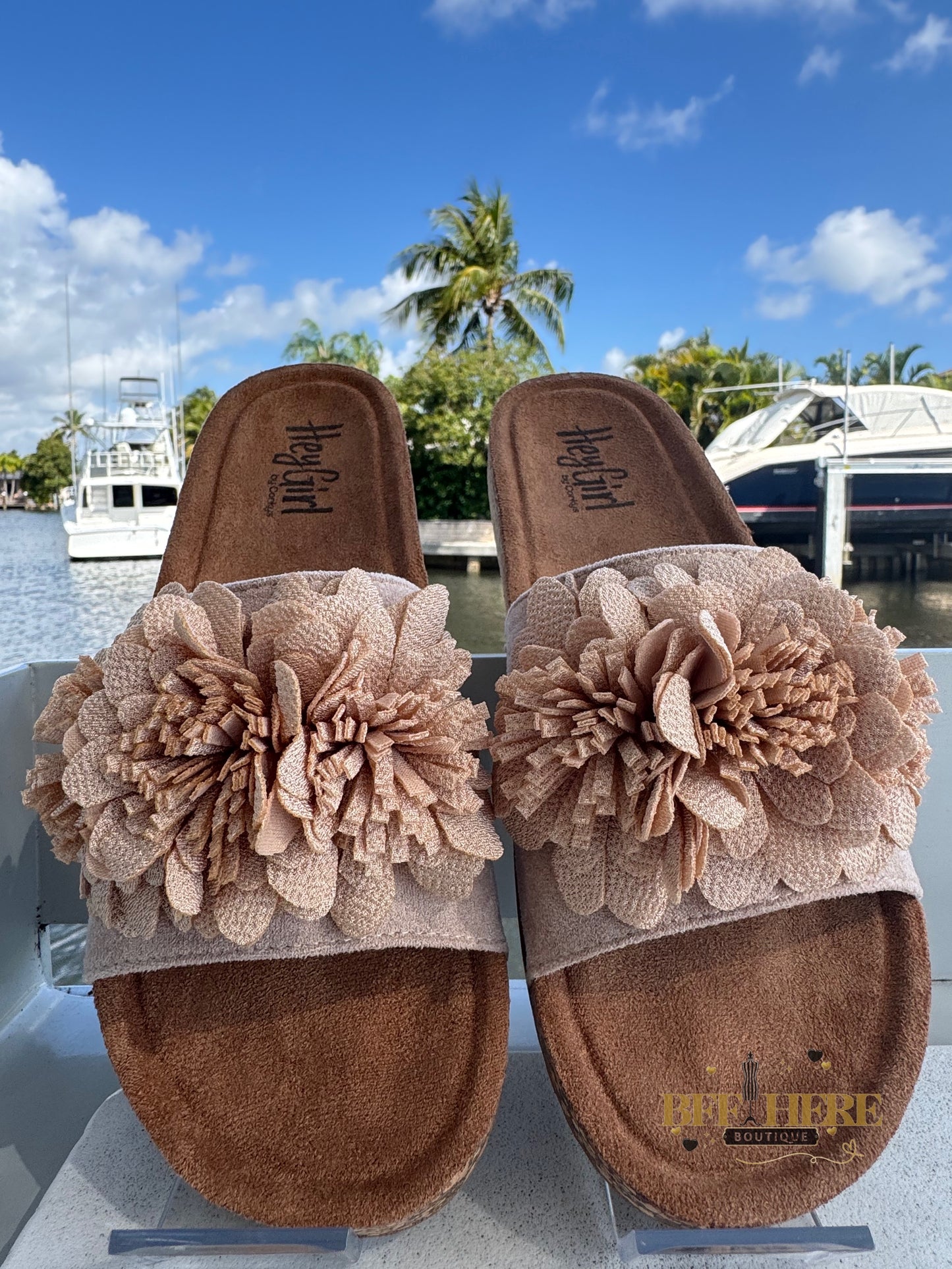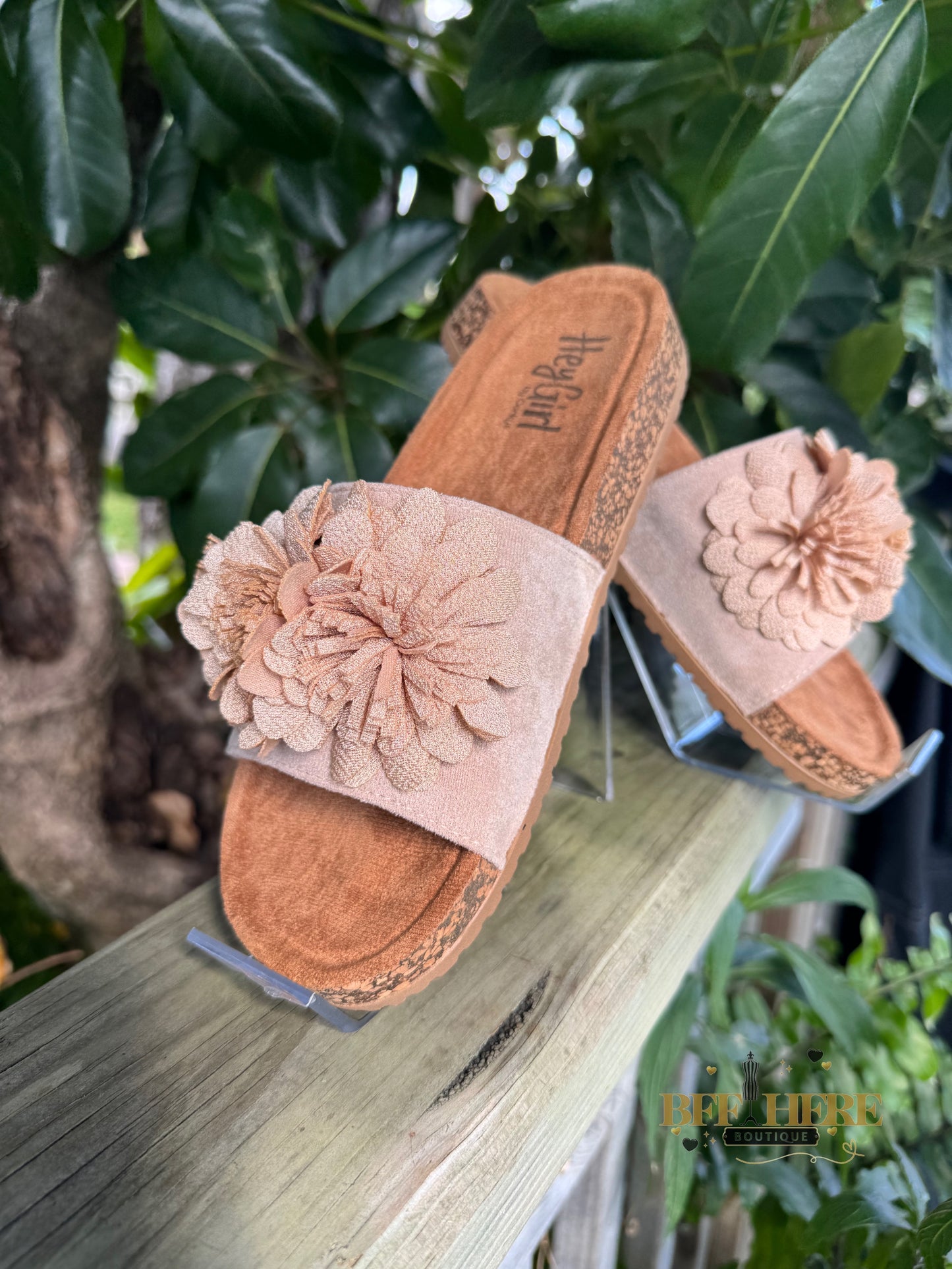 Get ready to turn heads with the Wild Child by Corkys! These ultra-feminine slide sandals bring the perfect mix of boho charm and effortless comfort. Featuring a plush floral embellishment, a soft suede-like footbed, and a cushioned sole for all-day wear, these beauties are a must-have for any free spirit.
